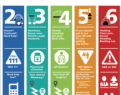 A poster to go on the walls of A&E at Northern General Hospital and Royal Hallamshire Hospital in Sheffield. The aim was to advise on the right course of action and alleviate pressure on A&E. The sheffield landmarks were to be catch the attention of patients and not be ignored.